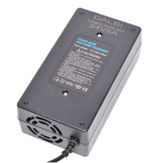 Incarcator Plumb Acid 24V - 5A Incarcator cu clesti de borne pentru acumulatori Plumb - Acid 24V. Acest incarcator electric este compact si foarte eficient , prevazut cu ventilator de aerisire si protectie de supraincalzire . Incarcator ce se alimenteaza la tensiune de retea 220V AC si poate incarca acumulatori pentru : Auto , Moto , Trotinete sau biciclete electrice ,Masinute de copii , etc. Led de indicare incarcare sau descarcare. Caracteristici tehnice: Cablu alimentare : 60cm Clesti cu cablu : 40cm Dimensiune : 167 x 87 x 57 mm Tensiune de alimentare : 110V - 240V AC Frecventa : 50-60Hz Tensiune de iesire : 24V DC Curent : 5A ATENTIE! NU folositi incarcatorul langa surse de apa , sau foc deschis. Inainde de conectarea la retea , puneti clestii pe bornele bateriei NU acoperiti incarcatorul in timp ce acesta este in functiune , Verificati polaritatea inainte de conectare. Produs fabricat sub standard CE si ROHS