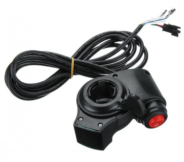 Maneta acceleratie simpla bicicleta / trotineta electrica. Conectorul pentru acceleratie este cu 2 fire + 1 mufa cu 3 fire. Se actioneaza prin apasare cu degetul. Nu conteaza daca bicicleta are baterie de 34V, 36V, 48V,60V, 72V, 84V iesirea din controller pentru acceleratie este la 5V.