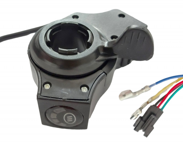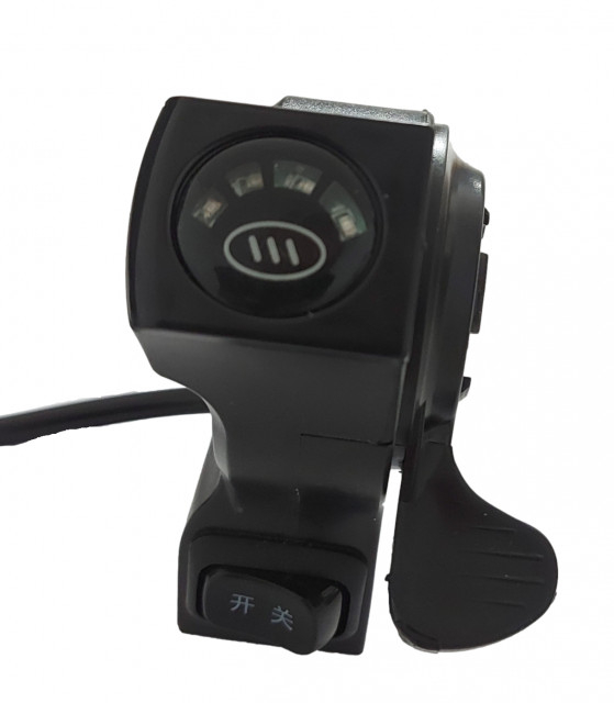 Maneta acceleratie simpla bicicleta / trotineta electrica 48V. Conectorul pentru acceleratie este cu o mufa 3 fire, un fir galben, un fir albastru Aceasta acceleratie este prevazuta cu intrerupator On-Off, si cu indicator nivel baterie. Se actioneaza prin apasare cu degetul.