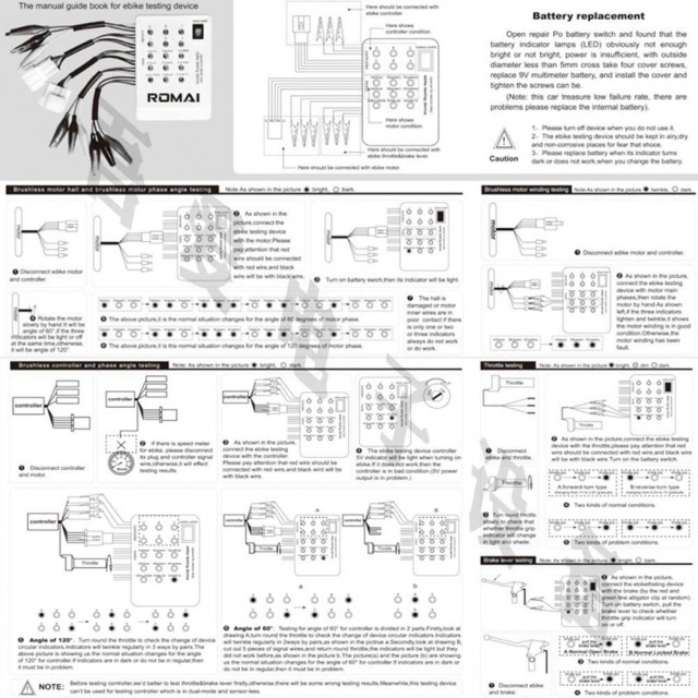 Tester controller universal bicicleta electrica (pentru motoare brushless - fara perii - cu senzori Hall) Compatibil cu : 24, 36, 48, 60, 72 Volti Ce puteti testa cu acest produs: iesirea 3 faze al controllerului i esirea controllerului catre senzorul HALL senzorii HALL la iesirea din motor iesirea din motor 3 faze acceleratie Specificații: Temperatura de lucru: -20 ° C-50 ° C Dimensiune: 10,5x7,5x2,5cm Putere: baterie de 9V (inclusă) Pachet inclus: 1x Tester motor fără perii 1x Manual în engleză 1x baterie 9v