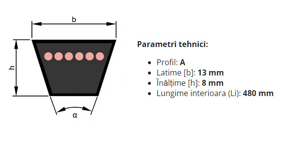 Curea motosapa, betoniera 13 x 480Li (trapezoidala). Lungime: 480mm (circumferinta interioara) Latime: 13mm