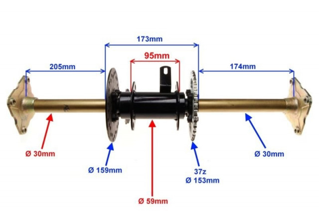 Ax roti spate complet ATV 90cc - 110cc. Compatibila cu: Kinroad Shineray Bashan Pentru dimensiuni va rugam sa consultati imaginile produsului.