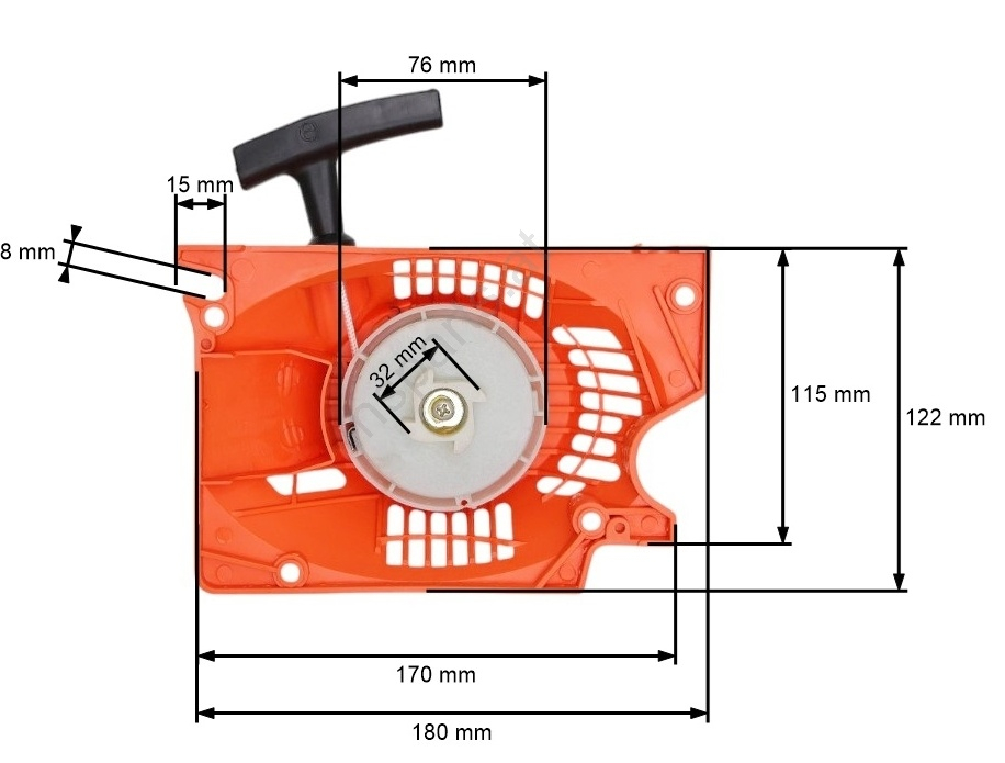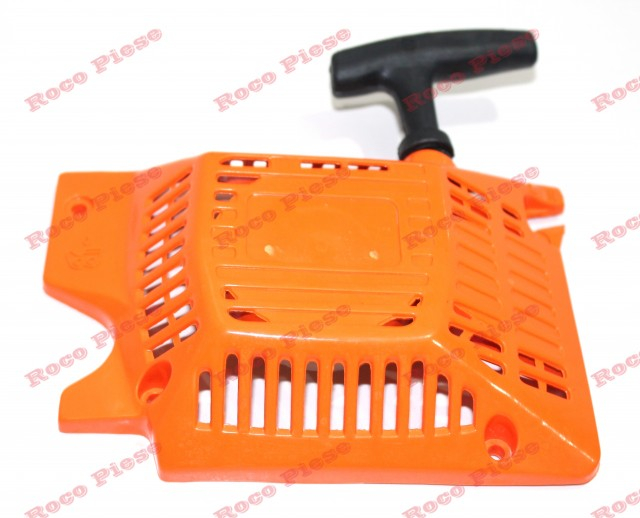 Demaror pornire de plastic pentru drujba chinezeasca cu prindere in 4 suruburi. Acest demaror este compatibil si cu drujba Ruris Expert 450. Demarorul vine complet echipat ! Pentru dimensiuni va rugam sa consultati imaginea de mai jos: Se potriveste pentru diverse modele de drujba chinezeasca printre care: Ruris Expert 450 Jenn Feng 4000, 4500, 5200; ALKO Einhell Grizzly Uraganul Regele Mestesug T alon Victus CS45 Faworyt TS45/52/460/520 NAC SPS01-45/SPS02-45/SPS0152/ Topsun T4516/T4518/T4518/T5016/50 Harder PN4500 Garland Micu Fermier Carpati etc. Mentionam faptul ca produsul nu este original, insa este compatibil pentru modelele enumerate mai sus .
