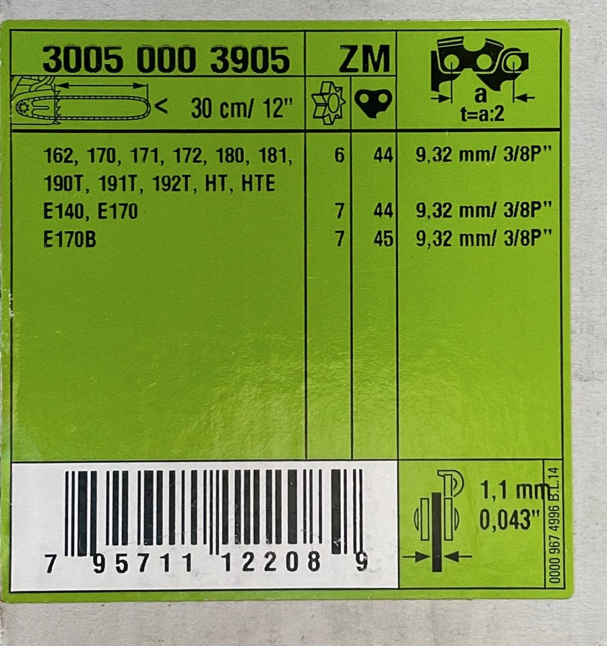 Lungime: 30 cm. Pas: 3/8; Zale: 44; Canal lama 1.1mm; Se potriveste pentru Stihl MS 170, MS 171, MS 180, MS 181, MS 192, 017, 018.