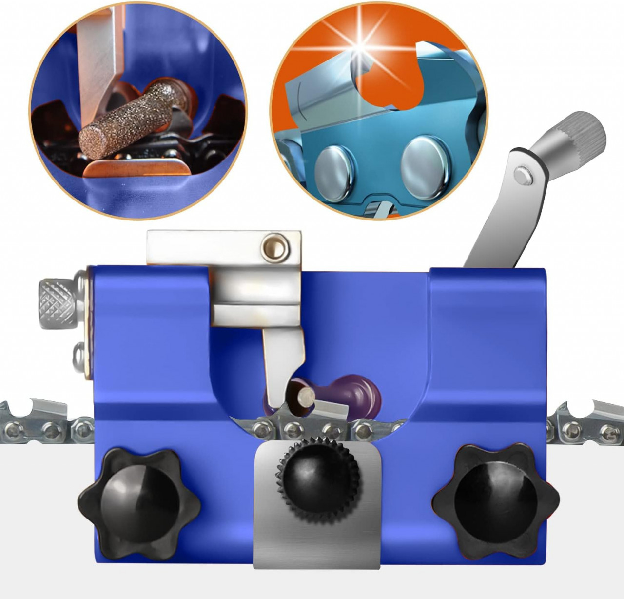 Dispozitiv pentru ascutit lant drujba (tip manivela). Ascutitoare de precizie. - o modalitatea usoara pentru ascutirea lantului - se utilizeaza fara demontarea lantului de pe sina de ghidaj - ofera unghiuri precise de taiere - se utilizeaza cu pile de toate marimile - ghideaza pila cu precizie - evita erorile si salveaza timpul Dispozitivul vine echipat cu 3 pile ! Tips: in loc de manivela se poate folosi o bormasina cu acumulator. Video despre cum functioneaza dispozitivul: