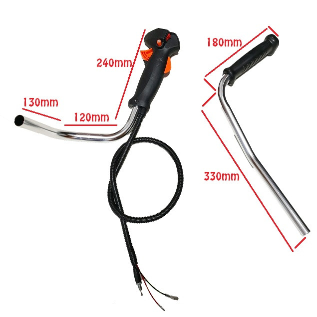 Set acceleratie motocoasa cu maner lung (stanga-dreapta) Maneta de acceleratie impreuna cu manerul sunt foarte importante atunci cand vorbim despre confortul pe care il dorim an momentul in care folosim o motocoasa intrucat acestea ne pot obliga sa adoptam o postura a corpului incorecta si obositoare. Acest model de acceleratie (unii mai numesc si ghidon de motocoasa) este gandit pentru a va usura munca si a o face mai placuta. Setul de acceleratie pentru motocoasa pe care vi-l prezentam se potriveste la majoritatea modelelor de pe piata, insa inainte sa comandati va rugam sa atrageti atentia asupra dimensiunilor (vezi in imaginea produsului) si a lungimii cablului de acceleratie (86cm) Pentru dimensiuni va rugam sa consultati imaginile produsului. Tara de provenienta: China