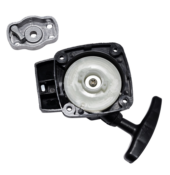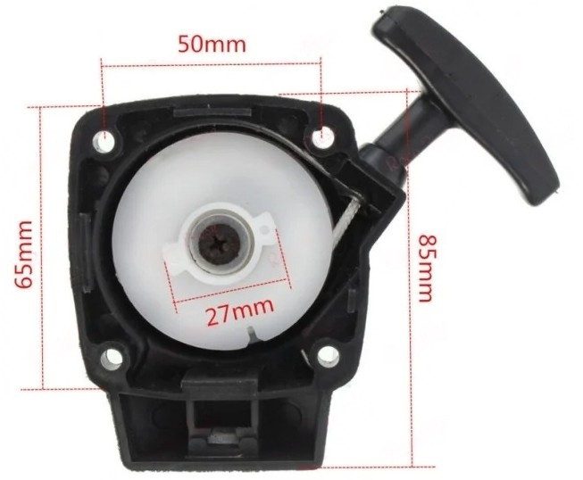 D emaror complet motocoasa. Demaror pentru pulverizator si atomizor de diferite modele ce se intalneste pe motoarele tip 1E34F, 25.4cc :NAC GTL26, GB34 , GBL NAC CG260B TEXAS CG 260 VICTUS BC26, Ruris A103 S, etc. Date tehnice: Dimensiuni demaror :L 85 mm; l 65 mm Distanta dintre gauri:50mm; Pentru dimensiuni va rugam sa consultati imaginile produsului.