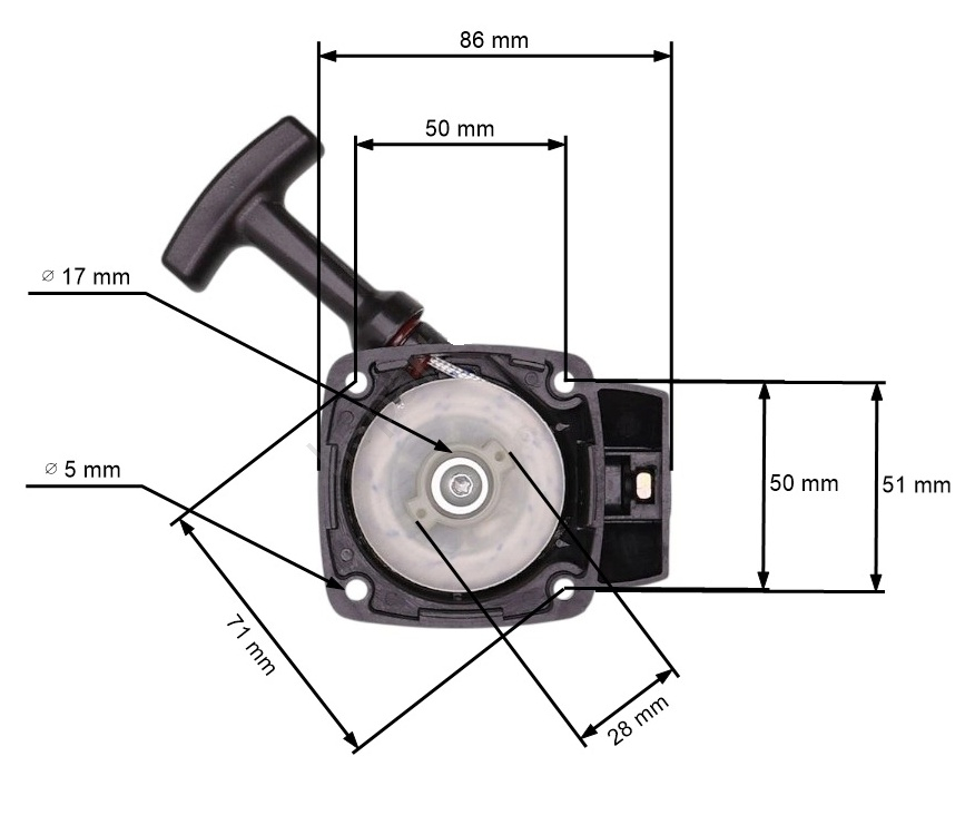 Demaror pentru pulverizator si atomizor de diferite modele ce se intalneste pe motoarele tip 1E34F, 25.4cc :NAC GTL26, GB34 , GBL NAC CG260B TEXAS CG 260 VICTUS BC26, Ruris A103 S, etc. Date tehnice: Dimensiuni demaror :L 85mm; l 65mm Distanta dintre gauri:50mm