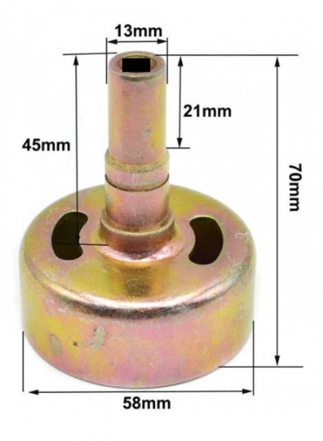 Oala ambreiaj pentru diverse modele de motocoase / motocositoare / trimere chinezesti. Model interior: (patrat 5x5mm) Diametru interior: 54mm; Diametru exterior: 58mm; Inaltime totala oala: 66mm.