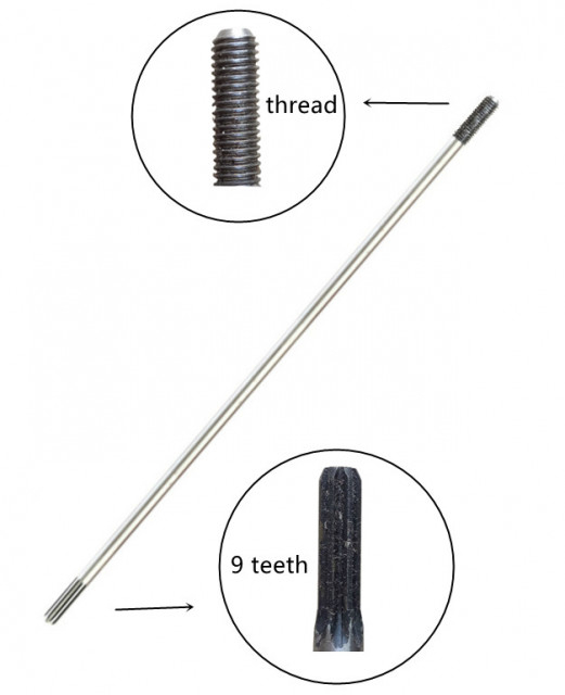 Ax angrenaj motocoasa 9 dinti - surub Lungime tija : 66 cm Diametru ax angrenaj : 8 mm Axul are intr-un capat 9 dinti iar in celalalt capat filet .