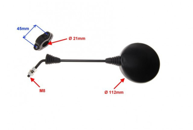 Oglinzi pentru scutere cu prindere colier. Descriere: filet: M8 x1.25 dreapta + filet dreapta material carcasa: plastic dimensiuni oglinda: Ø 104mm