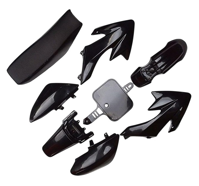 Set carenaj (plastice + sa) negru pentru Cross CRF50/XR50 (8 elemente). Posibile zgârieturi locale sau zgârieturi minore cauzate în timpul producției, transportului și depozitării.