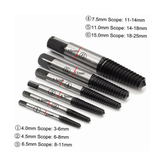 Dispozitive pentru extras suruburi deteriorate (model 1) 6 X Extractor de șuruburi (3-6, 6-8, 8-11, 11-14, 14-18 și 18-25) 6 X burghie (3/32, 1/8, 3/16, 1/4, 5/16 și 3/8 inchi)